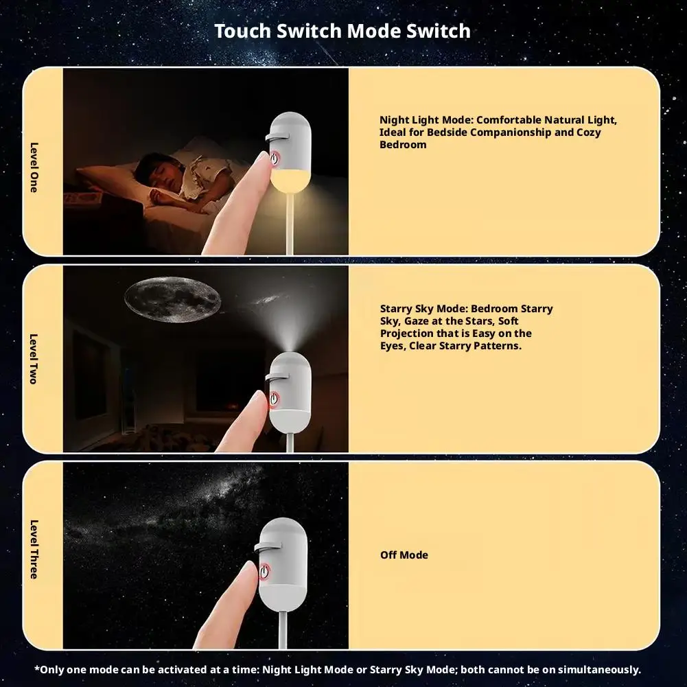 3. Dual-Mode Illumination: Seamlessly switch between a captivating starry sky projector and a soothing warm night light. Designed with a highly accessible, easy-to-reach button, it requires minimal physical effort to toggle modes. This design provides the exact ambiance you need, whether unwinding after work or waking up in the dark.
