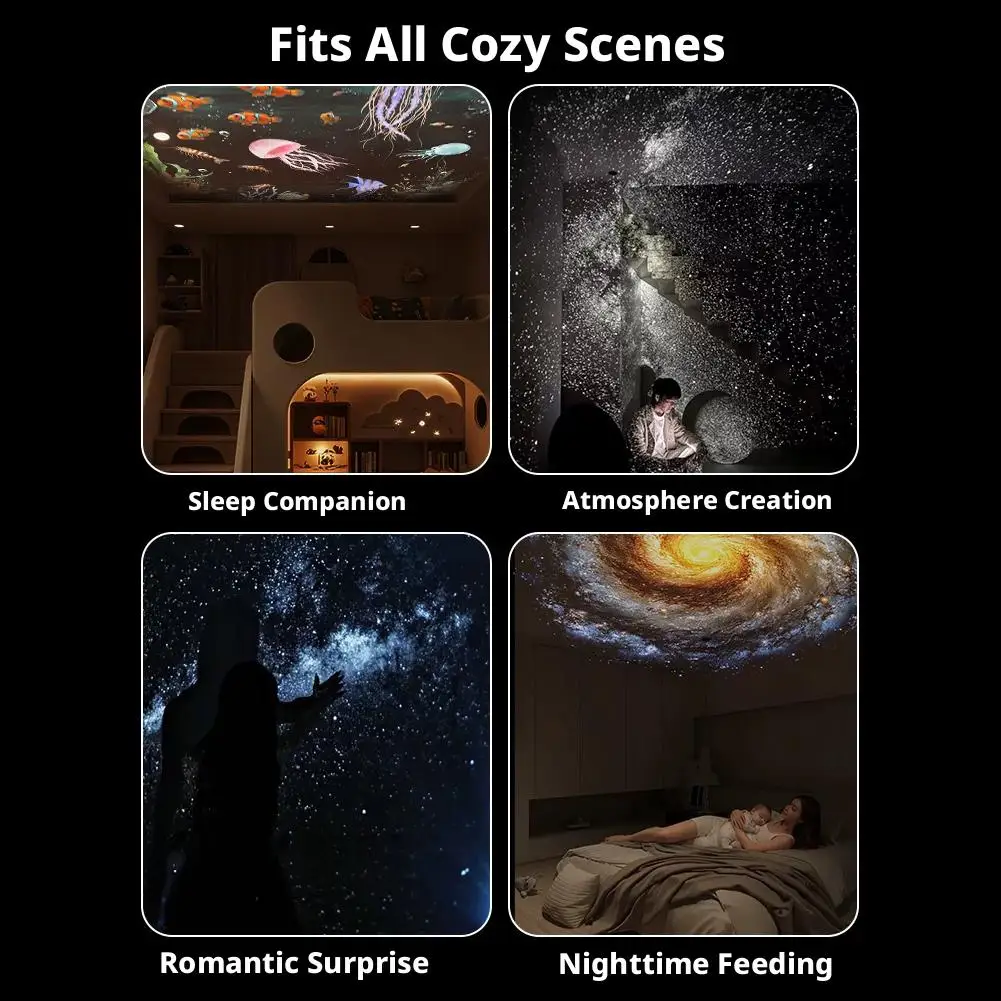 4. Customizable Projection Scenes: Elevate your bedroom aesthetic with multiple interchangeable projection films, including a stunning sunset effect. You can effortlessly swap the cards to create a personalized, relaxing atmosphere that brings a delightful surprise to your daily routine, romantic dinners, or festive home gatherings.